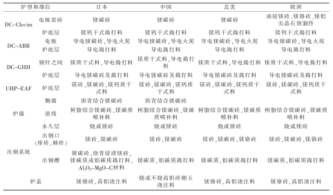 摘 要:由三根電極的普通交流電弧爐發(fā)展為超高功率(UHP)及一根電極的直流(DC)電弧爐,爐體結(jié)構(gòu)有一些改變。針對各部位的損毀因素,內(nèi)襯用的耐火材料也有所發(fā)展。例如普通電弧爐的爐頂用高鋁磚、爐墻鎂磚砌筑,而UHP及DC電弧爐采用大面積水冷爐頂、爐墻,爐頂三角區(qū)采用剛玉澆注料或預(yù)制件,爐墻用鎂碳磚,蝕損嚴(yán)重部位采用噴補作業(yè)。還介紹了日本等一些國家DC和UHP的各種爐型用耐火材料。煉鋼電弧爐是以電極端部和爐料之間發(fā)生的電弧為熱能進行煉鋼的設(shè)備。電弧爐以廢鋼為爐料直接煉鋼,與礦石煉鐵后再煉鋼相比,基建投資少,節(jié)能60%、節(jié)水40%、減少廢氣排放86%、減少廢渣97%[1]。交流電弧爐歷史悠久,交流電是通過三根石墨電極輸入爐內(nèi),在電極下端與金屬料之間產(chǎn)生電弧,利用電弧高溫直接加熱爐料,使煉鋼過程得以進行。供電功率越高,爐料熔化速度越快,降低能量消耗越多,因此出現(xiàn)超高功率(UHP)電弧爐。在超高功率的基礎(chǔ)上發(fā)展了直流(DC)電弧爐煉鋼。直流電弧爐是以一根石墨電極的端點為陰極,爐底為陽極,石墨電極位于爐膛中心部位。與UHP相比設(shè)備結(jié)構(gòu)簡單,建設(shè)費用低,熔池中的電流與熱量分布比較均勻,不存在過熱區(qū)域,因此耐火材料損耗比較小、節(jié)能且噪音小等。目前,煉鋼電弧爐向大型化、控制自動化方向發(fā)展。我國的電弧爐主要用來生產(chǎn)合金鋼。煉鋼水平與工業(yè)發(fā)達國家相比差距較大,如2015年我國電爐鋼占粗鋼總產(chǎn)量的6.1%,2020年有所提高,但也不超過10%,與世界平均水平的30%相比還有較大差距。我國已經(jīng)引進先進水平的UHP和DC電弧爐,隨著經(jīng)濟發(fā)展,工業(yè)化程度提高,必然伴以廢鋼資源數(shù)量增加,同時發(fā)展鐵礦石直接還原煉鐵技術(shù),代替廢鋼,增加電弧爐煉鋼的爐料,還有核電的發(fā)展,使電弧爐煉鋼有了物質(zhì)保證。電弧爐的內(nèi)襯是耐火材料構(gòu)成的,隨著UHP和DC技術(shù)的發(fā)展,需要新型優(yōu)質(zhì)耐火材料與之相配套。有人說[2]:沒有優(yōu)質(zhì)爐襯、爐底耐火材料支持長壽爐齡,超高功率電弧爐就無法發(fā)揮高效生產(chǎn)的優(yōu)勢。爐底耐火材料是直流電弧爐得以實現(xiàn)的必要條件,反映了煉鋼與耐火材料技術(shù)的互相影響,互為依存,在電弧爐煉鋼系統(tǒng)優(yōu)化生產(chǎn)中有不可分割的作用。1 電弧爐的結(jié)構(gòu)變化傳統(tǒng)的電弧爐由爐頂(又稱爐蓋)、爐墻、爐坡、爐底和出鋼槽構(gòu)成,全部用耐火材料構(gòu)筑,外包鋼制爐殼。爐墻一側(cè)設(shè)有爐門,另一側(cè)為出鋼口,并與出鋼槽相連。而UHP和DC電弧爐采用偏心爐底出鋼,使?fàn)t體由傾動式改為固定式,爐底有供氣攪拌設(shè)置,爐頂安裝氧-燃料燒嘴,在爐底偏心位置設(shè)置出鋼口,代替出鋼槽。由于取消了傾動設(shè)備,擴大了水冷面積,緩和了爐襯的損毀,適當(dāng)降低了出鋼溫度,并縮短了出鋼時間,從而降低生產(chǎn)成本。爐墻采用鑲砌水冷箱式水冷套措施,其內(nèi)表面噴涂一層耐火涂料,使其掛渣形成保護層,可有效降低耐火材料消耗,但電耗可能增加。國外有的電弧爐功率達1 000 kV·A/t以上,爐墻壽命達2 000爐次以上,水冷爐蓋壽命達4 000爐次,降低耐火材料消耗60%以上。2 耐火材料內(nèi)襯的損毀因素電弧爐內(nèi)襯的耐火材料長期處于高溫、熔渣侵蝕和急熱急冷狀態(tài)下,工作條件極其惡劣。在煉鋼的熔化期和氧化期,不致于因高溫?fù)p壞爐襯,但在還原期的鋼液溫度相當(dāng)高,又受電弧直接輻射(有時溫度達4 000℃以上),爐襯很容易造成熔融損壞。出完鋼裝料時,爐襯溫度突然下降,裝完料開始送電,溫度又逐漸升高,這種急冷急熱是爐襯剝落的直接原因,主要是爐頂容易剝落。耐火材料內(nèi)襯損毀的主要因素包括[3]:(1)化學(xué)侵蝕。FeO或渣中SiO2與耐火材料中的CaO、MgO之間的化學(xué)反應(yīng),使?fàn)t襯變?yōu)槿墼鴮?dǎo)致?lián)p毀。(2)耐火材料內(nèi)襯中的碳成分被含氧成分(如FeO、O2、MgO等)氧化,導(dǎo)致耐火材料脫碳而損毀。(3)沖刷和機械沖擊。鋼水或熔渣流過耐火材料表面,以物理性磨損或沖刷爐襯,而導(dǎo)致內(nèi)襯損毀;在出鋼口、渣線、電極口或排氣口平臺等沖刷嚴(yán)重,廢鋼等爐料吊入往往撞擊爐襯而損毀。(4)水化。在生產(chǎn)過程中,往往會出現(xiàn)爐頂或爐墻漏水或滲水,還有水蒸氣,與堿性耐火材料中的MgO、CaO進行水化反應(yīng),使內(nèi)襯損毀。3 電弧爐用耐火材料根據(jù)電弧爐的結(jié)構(gòu),由于各部位承受的熱負(fù)荷大小不同,與熔渣、鋼水接觸作用及機械損壞程度存在差異,不同部位必須采用不同的耐火材料[4]。3.1 爐頂(蓋)我國中小電弧爐普遍采用燒成或不燒高鋁磚,局部用高鋁質(zhì)或剛玉質(zhì)不定形耐火材料預(yù)制件。大型超高功率電弧爐和直流電弧爐采用水冷技術(shù),除三角區(qū)外,爐頂耐火材料不是關(guān)鍵。三角區(qū)由于強烈熱震及電極熱輻射苛刻,國外普遍采用剛玉質(zhì)或鋁鉻質(zhì)搗打料,我國一般用高鋁質(zhì)或剛玉質(zhì)搗打料。天津鋼管集團公司150 t超高功率電弧爐,爐頂三角部分(三個電極孔周圍)采用鉻剛玉質(zhì)澆注料預(yù)制件,預(yù)先烘烤,現(xiàn)場直接使用,并解決了